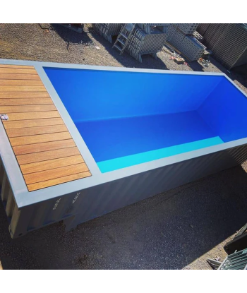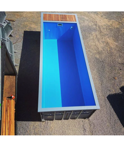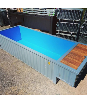 Piscina lista para usar, instalada en un contenedor marítimo de 6 metros, totalmente equipada con cubierta impermeable y tarima de madera. Ideal para jardines, hoteles, campings o eventos.